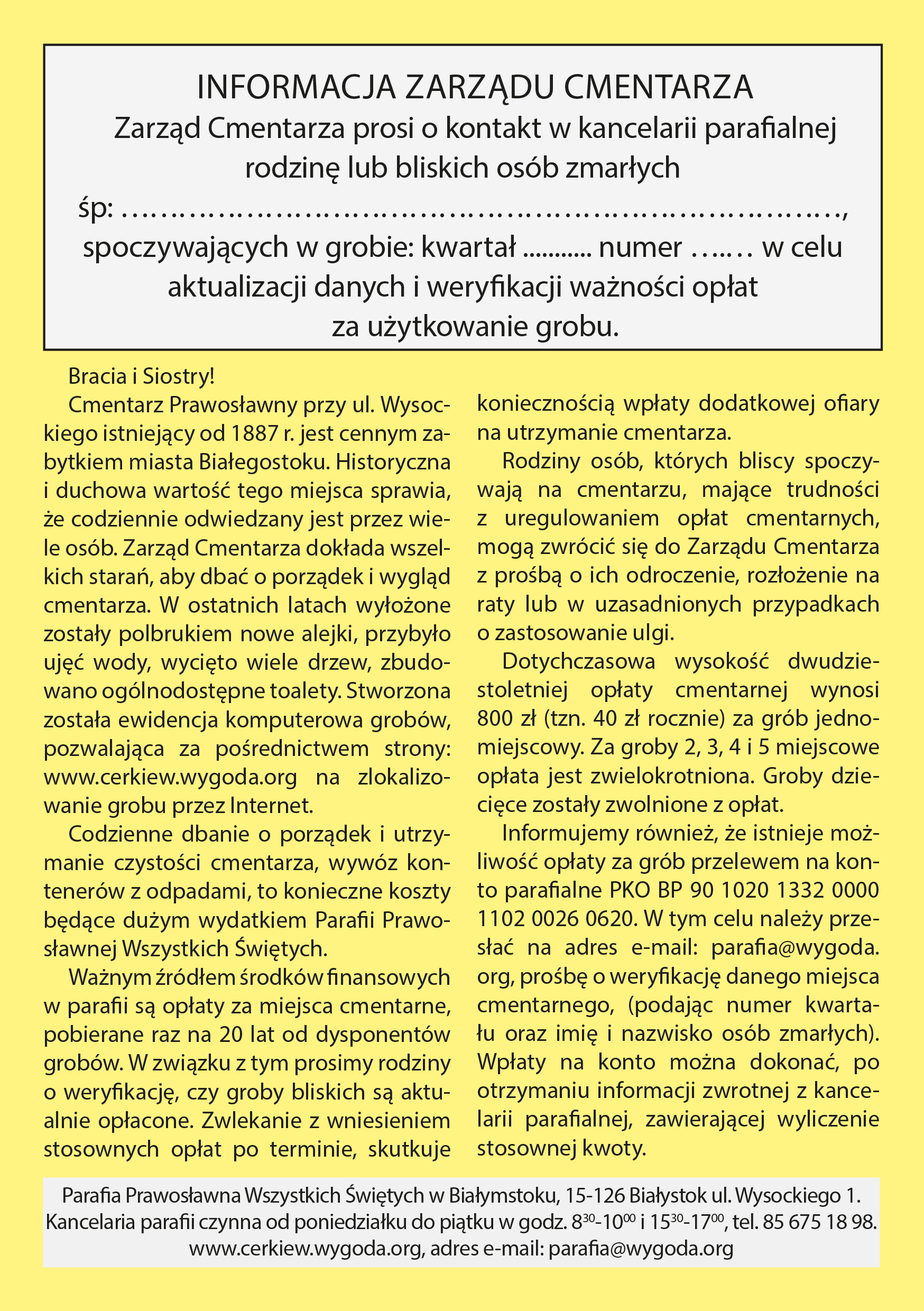 (np. sprzątanie grobu, mycie nagrobka, zapalanie zniczy). Szczegółowe informacje w kancelarii parafialnej.